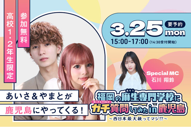 3月25日(月)に西日本最大級の専門学校グループ 学校法人麻生塾/麻生専門学校グループ(理事長:麻生 健)が、ライカ南国ホール(鹿児島市)にあいささん、須藤大和さん、スペシャルMCに石川翔鈴さんお迎えし、高校1・2年生限定の無料イベント(要予約)を開催します。