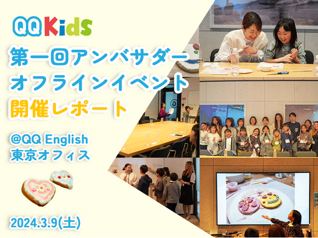 株式会社QQ English (本社:東京都渋谷区、代表取締役:藤岡 頼光)は、2024年3月9日、子ども専門オンライン英会話サービス「QQキッズ」の公式アンバサダーとして活躍する7名とそのお子様(小学校3~5年生)を対象に、東京のQQ Englishオフィスにて「第1回QQキッズアンバサダーイベント」を開催いたしました。