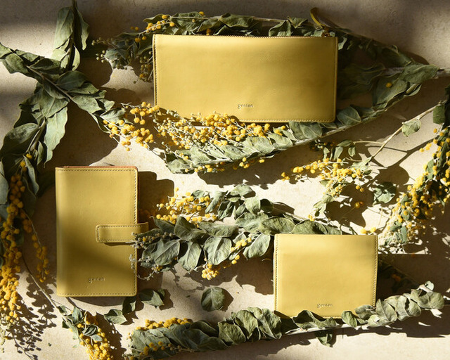 左上から時計回りに、カードケース(ライムイエロー※こちらの色は参考見本です。この型は継続色の20番色(グレー)と75番色(カーキ)でご用意しています)16,500円(税込)、長財布(ライムイエロー)23,100円(税込)、二つ折りBOX財布(ライムイエロー)20,900円(税込)