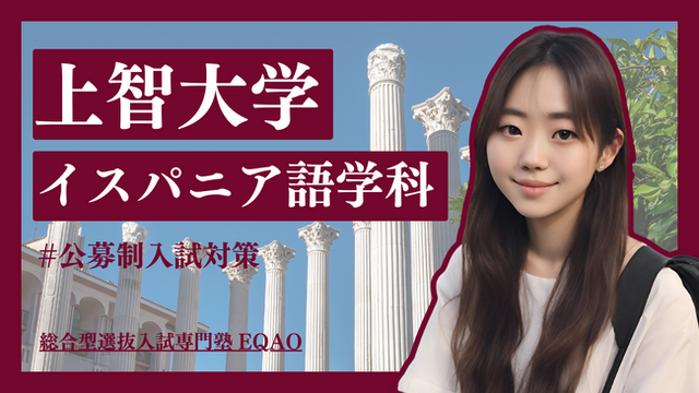 上智大学の推薦受験で特に高い合格率を誇っている塾っぽくない塾EQAOが、無料体験授業受付中!上智大学外国語学部イスパニア語学科に推薦合格したい高校生は必見!外国語学部は上智大学の中でも花形の学部と言われ、受験生から高い人気を集めています。「上智大学のイスパニア語学科に推薦合格したいけど何から始めればいいか分からない…」と悩んでいる高校生は今すぐEQAOへご相談ください。言語学習に強く人気が高い上智大学の外国語学部に合格するためには早くから準備することが必須です。今すぐ動き出して合格を掴み取りましょう!オンライン塾も開講しているため、全国各地の高校生が受講することが出来ます!上智大学推薦合格ならEQAO!受付開始時期3/24~
