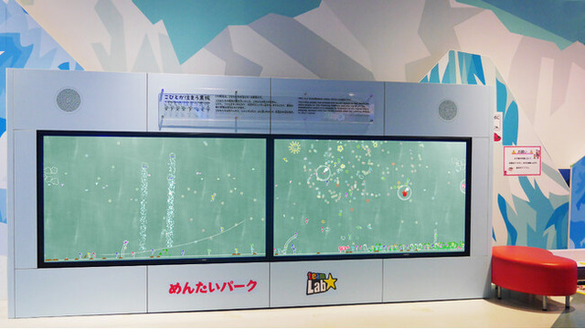 《こびとが住まう黒板》の中には、こびとや、めんたいパークのキャラクター、タラコン博士とタラピヨが住んでいます。こびとたちは黒板の中を歩いていて、こちらには気づきません。しかし、黒板の中のこびとやタラコン博士、タラピヨ、シャボン玉などにタッチしたり、線を引いたりすると、インタラクティブに世界が変化していきます。