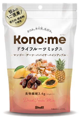 ナッツ・ドライフルーツ類を中心とした原料の調達、生産・加工、流通・販売を一気通貫で行うことを強みとする、正栄食品工業株式会社(本社:東京都台東区 代表取締役社長:本多秀光)は、2024年4月1日(月)に菓子ルート向けナッツ・ドライフルーツブランド『Kono:me(コノミィ)』シリーズの第三弾商品「ドライフルーツミックス」を発売いたします。当ブランドは「真に美味しいナッツ・ドライフルーツを日常に浸透させ、より身近なものに」というミッションを掲げており、素材本来の味わいや品質を訴求しながら、消費者の皆様により手に取っていただきやすく、よりナッツ・ドライフルーツを身近に感じられ、日常に取り入れていただけるような商品を随時発売して参ります。