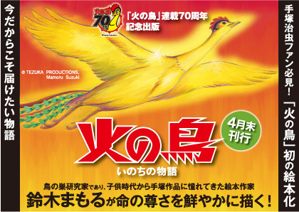 刊行のきっかけは、著者・鈴木まもるさんご出演のラジオ番組を、手塚プロダクション関係者が偶然聴いたこと。鈴木まもるさんが子どもの頃から手塚治虫先生のファンで多大な影響を受け、今は絵本作家に加え、鳥の巣研究の第一人者でもあることを知り、原作「火の鳥」70周年企画として子供向けの絵本『火の鳥』をオファーし、実現しました。