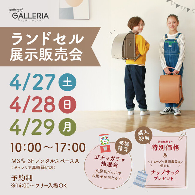 400ブランド以上のバッグ・ライフスタイルグッズをセレクトする「ギャレリア高崎緑町店」(運営:株式会社ギャレリア・ニズム)は、同社が運営する複合商業施設「M3 ㌱」のレンタルスペースにて、2024年4月27日(土)~4月29日(月)の3日間に渡り、ランドセル展示販売会(2025年度ご入学向け)を開催いたします。