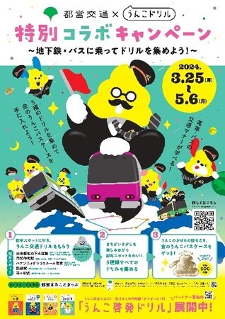 東京都交通局(東京都新宿区西新宿2-8-1、交通局長:久我英男)と株式会社文響社(本社:東京都港区虎ノ門2-2-5、代表取締役社長:山本周嗣)は、「電車・バスでの交通マナーを学べるうんこ交通ドリル」(以下「ドリル」)を集めるイベント「都営交通×うんこドリル特別コラボキャンペーン~地下鉄・バスに乗ってドリルを集めよう!~」を実施します。