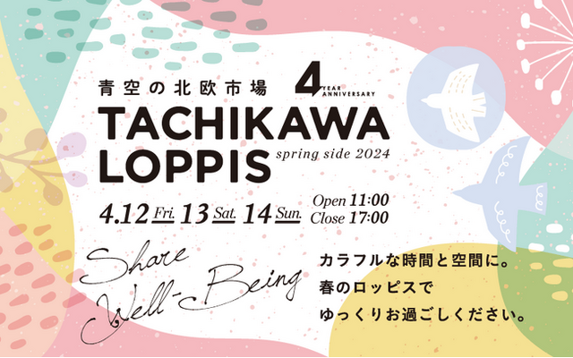 4月12日(金)~14日(日)、ウェルビーイングの発信を目的としたイベント「青空の北欧市場 TACHIKAWA LOPPIS spring side 2024(タチカワロッピス スプリングサイド2024)」を開催します。