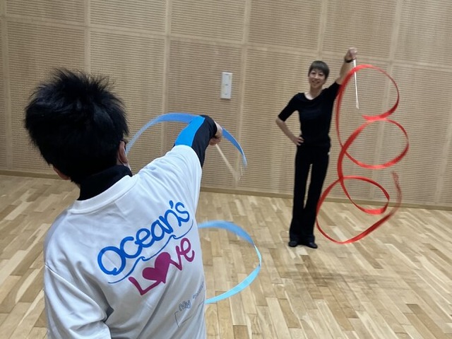 最初に柔軟体操や音楽に合わせたウォーミングアップを行い、身体を温めてからリボンの練習をしました。