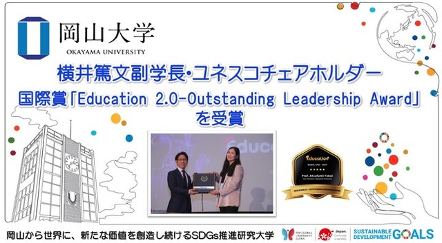 国立大学法人岡山大学(本部:岡山市北区、学長:那須保友)の横井篤文副学長・ユネスコチェアホルダーが、アラブ首長国連邦のドバイで開催された教育の国際会議「Education 2.0」の授賞式において、国際賞「Education 2.0-Outstanding Leadership Award」を受賞しました。