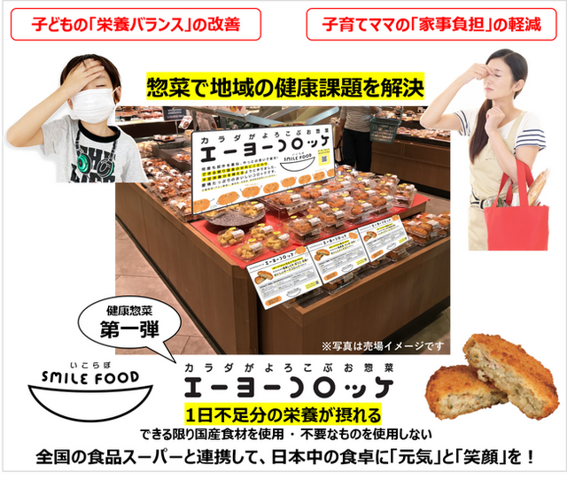 このような背景から、子どもの栄養バランス改善と多忙なママのサポートを目指し、不足しがちな栄養をおいしく・手間なく・気軽に摂れる「カラダがよろこぶお惣菜」の開発に着手、「エーヨーコロッケ」を完成させました。