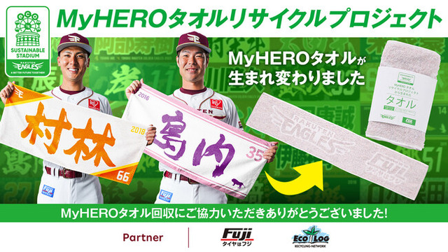 楽天イーグルスでは、サステナブルな取り組みの一環として、不要になった応援グッズを新たな価値あるものへと生まれ変わらせる「リサイクルプロジェクト」を実施しています。今回のオリジナルタオルは、昨シーズン約1カ月間にわたって回収をした15,268枚分のMyHEROタオルをリサイクルして製作しました。