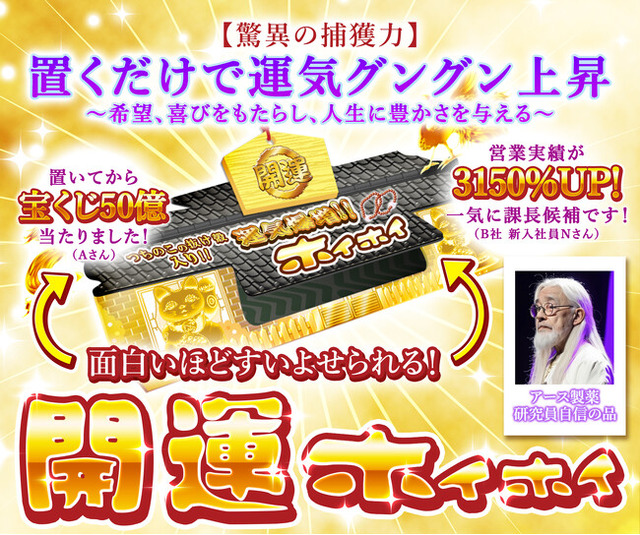 そこでマーメイドの涙を加えた25パターンの配合調整にて分析した結果、すごい数値を叩き出しました。その数値はなんと8万ルミナス。この配合になってから開運ホイホイの驚くべきパワーを確信する出来事が起こりました。開発に携わった社員の運気もどんどん上がりました。競馬に行けば万馬券、パチンコに行けば連日フィーバー、さらに彼女ができた社員も。全ての野望まで叶わせる力があります。このようにこの「開運ホイホイ」には運気を集めて人を幸せにする力があります。
