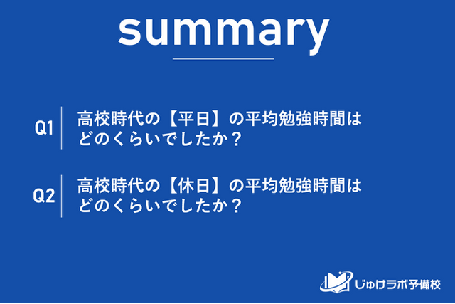 じゅけラボ予備校(所在地:大阪市北区、代表取締役:後藤智則)は、大学受験で第一志望大学に現役合格した1,074名を対象に、高校生時の勉強時間に関する調査を実施しました。
