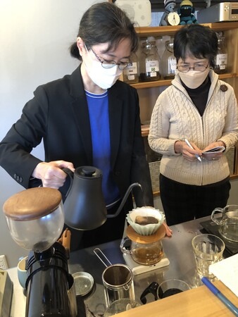 ケトルを片手に研修にはげむカフェスタッフ