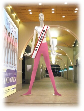 骨戦隊Tシャツにレギンスでユミコア新人トレーナーとして名鉄百貨店本店[メンズ館] 1階エントランス前に佇むナナちゃん