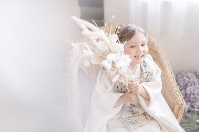 特に、ビンテージとは異なる味わいのコフレオリジナル和装は七五三撮影でも大変人気が高く、ごきょうだいやご家族様のトータルコーディネートのご提案や、お⾐装のレンタルも可能です(※3)。お宮参りの産着レンタルサービスも承っており(※4)、撮影前後1か月の期間であれば無料でご利用いただけます。