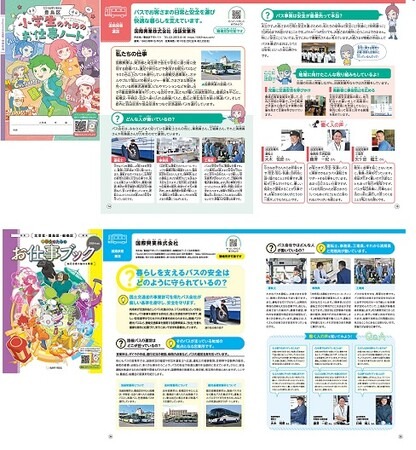 この度、当社営業所がある豊島区、練馬区、板橋区、北区の4地区で小学校3、4年生向けに36,000部、中学校2年生向けに35,500部が発行され、その中で当社のバス営業所の仕事内容や方針について、写真やイラストを用いて解りやすく説明されています。