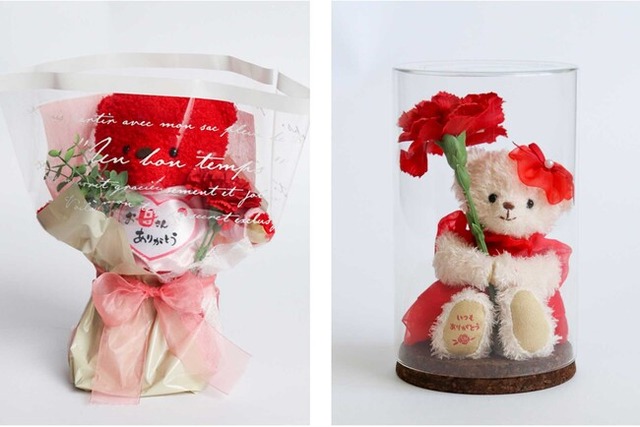 グラス入りカーネーションベアは、「いつもありがとう」の刻印入りのテディベアがカーネーションをぎゅっと抱えた、母の日限定ギフトです。
