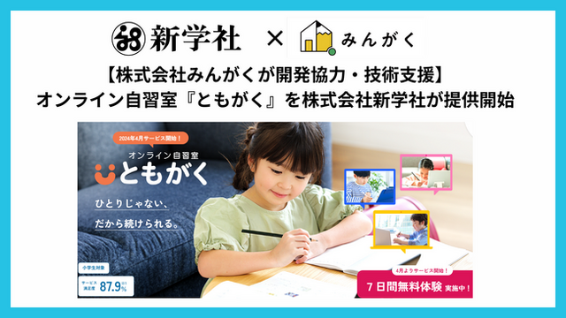 2024年4月4日、株式会社新学社(本社:京都市、代表取締役社長:山本 伸夫)は、家庭学習の習慣化”を実現するオンライン自習室「ともがく」のサービス提供を開始しました。教育サービス開発を手掛ける株式会社みんがく(本社:東京都目黒区、代表取締役:佐藤 雄太)が本サービスの開発協力・技術支援をしています。