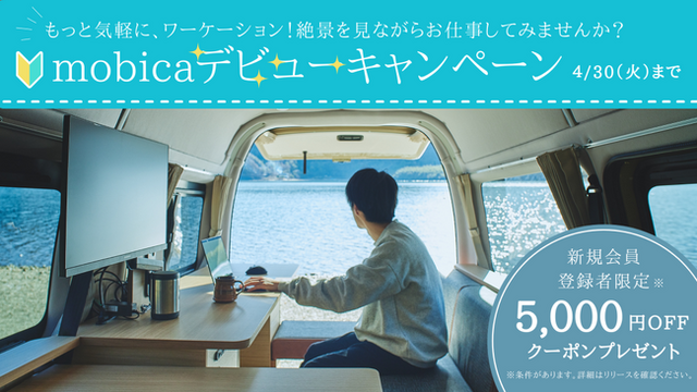 建物のリノベーション、オフィス構築、バックオフィス業務のアウトソーシングを通じて「より良い場」を創造する建築会社の株式会社GOOD PLACE(旧株式会社コスモスモア、本社:東京都渋谷区、代表取締役社長:枝廣 寿雄)は、好きな場所へ移動しながら車内外で快適に働くことができるワーケーションカー「mobica(モビカ)」をお得に利用できる「mobicaデビューキャンペーン」を、2024年4月5日(金)から開始いたします。本キャンペーンでは、指定の会員登録ページから新規で会員登録した方限定で、会員登録後すぐに利用できる5,000円OFFクーポンをプレゼントします。