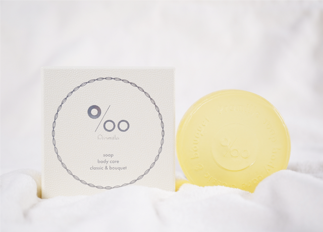 『プロミルオイル』をモチーフにした透明感のある淡いイエローの石けんには、ブランドロゴを刻印しました。シックなレザー調のボックスにシルバーの箔押しをした高級感のあるパッケージは、自分へのご褒美にも、大切な人へのギフトにもおすすめです。