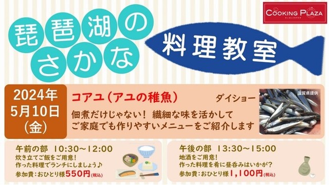 教室は全4回シリーズとなっており、コアユやビワマスなど、毎回異なる湖魚を美味しく食べるレシピをご紹介します。第1回目となる今回は、コアユを使ったご家庭でも作りやすいメニューをご紹介します。ご自身で作ったお料理でランチや昼呑みなどをお楽しみいただけます。男性やおひとり様でのご参加も大歓迎ですので、ぜひふるってご参加ください。平和堂は、地域の皆様に湖魚を身近に感じ召し上がっていただくことで、漁業関係の皆様を応援するとともに、持続可能な滋賀県の農林水産業を考えるきっかけをご提案してまいります。