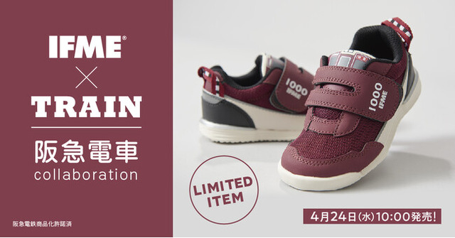 「IFME×TRAIN キッズスニーカー 阪急電車」は、TRAINシリーズ初となる私鉄とのコラボ商品として登場し、2022年の発売後すぐに完売となり、再販売希望のお声をたくさんいただいた人気商品です。この度、数量限定でIFME有明ガーデン店と公式オンラインストア、阪急電車グッズ公式オンラインショップにて、再販売することとなりました。
