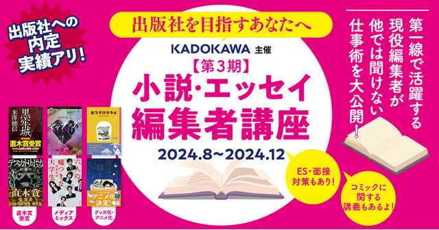 株式会社KADOKAWA(本社:東京都千代田区、取締役 代表執行役社長 CEO:夏野剛)は、昨年度に引き続き、出版社を目指す方を対象とした「小説・エッセイ編集者講座(第3期)」を2024年8月30日(金)より開催します。小説やコミックエッセイなど様々なジャンルの第一線で活躍する書籍編集者が出版業界の裏側や仕事術を大公開! さらに、面接官をつとめた経験のある社員が就活で必須のESの書き方や面接のポイントをレクチャーします。