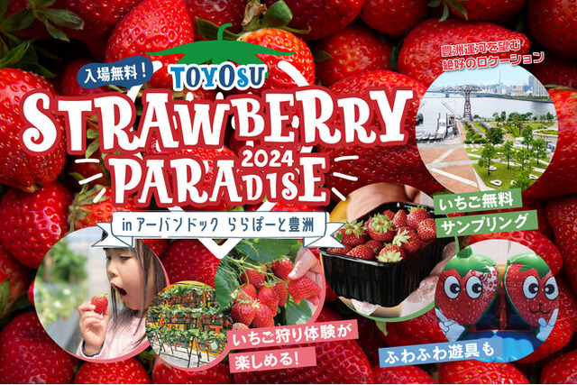 株式会社サエキジャパン(所在地:福岡市中央区清川、代表取締役社長 佐伯岳大:株式会社Mr.Weihnachtsmann)が主催する「TOYOSU STRAWBERRY PARADISE in アーバンドック ららぽーと豊洲」がアーバンドック ららぽーと豊洲ウッドデッキの会場でいよいよ4月11日12時からスタート。会場ではイチゴ狩りや無料配布もお楽しみいただけます。心ゆくまでイチゴを満喫してください。