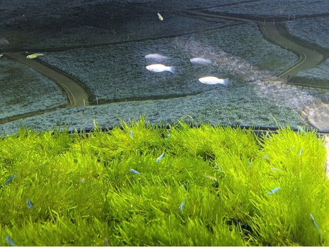 ネモフィラのように美しい青色が特徴の「ベルベットブルーシュリンプ」、澄み切った青空に浮かぶ雲のように、白く輝く体色が印象的な「シルバーモーリー」、そびえ立つ木の青々とした葉をイメージさせる体側がメタリックグリーンに染まっている「ミクロラスボラブルーネオン」が登場し、この3種が「みはらしの丘」の絶景を再現します。