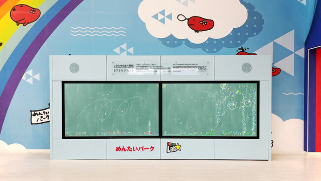 《こびとが住まう黒板》の中には、こびとや、めんたいパークのキャラクター、タラコン博士とタラピヨが住んでいます。こびとたちは黒板の中を歩いていて、こちらには気づきません。しかし、黒板の中のこびとやタラコン博士、タラピヨ、シャボン玉などにタッチしたり、線を引いたりすると、インタラクティブに世界が変化していきます。
