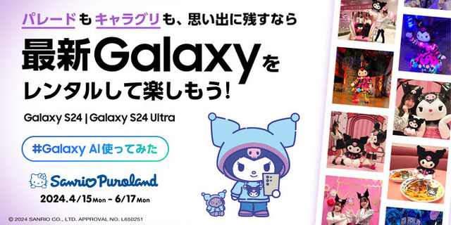 サムスン電子ジャパン株式会社は、最先端のAI技術を搭載した最新フラッグシップモデル「Galaxy S24」「Galaxy S24 Ultra」の無料レンタルサービス「#Galaxy AI使ってみたinサンリオピューロランド」を今月より開始いたします。