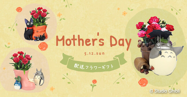 ジブリがいっぱい どんぐり共和国で毎年人気の配送専用のフラワーギフトは、「となりのトトロ」や「魔女の宅急便」をテーマにデザインしたプランターと、開花後も育てやすい色鮮やかな生花のカーネーションがセットになっています。日本全国へのお届けが可能(一部離島を除く)で、母の日の期間にあわせて大切な方の元へお届けいたします。