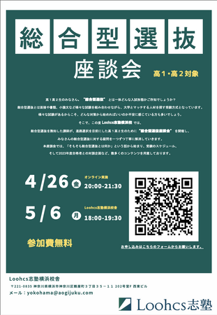Loohcs志塾横浜校舎では、総合型選抜を熟知した講師が進路選択を目前にした高1生と高2生のために総合型選抜座談会を開催し、みなさんの総合型選抜に対する疑問を解消していきます。