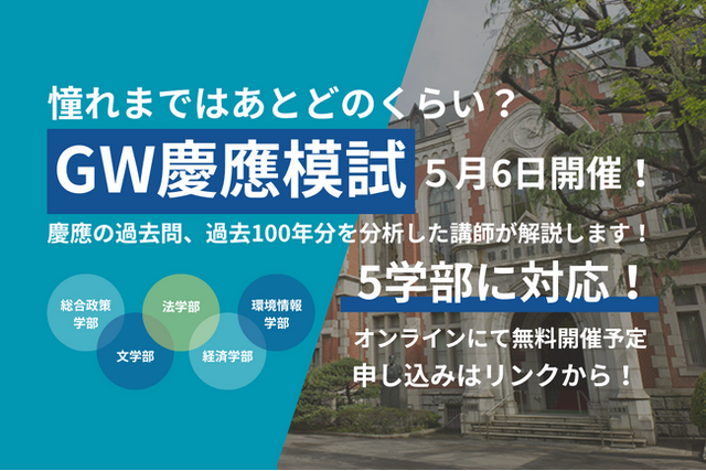 英語や社会、小論文、今の自分の点数は把握していますか?それに見合った残り時間の勉強方針は立てられていますか?合格に必要な勉強と自分の合格までの足りない部分、もう一度確かめてみませんか?LogicLinkでは、慶應5学部対応の『GW慶應模試』を5月6日(月)に無料開催いたします。また、過去10年分から分析された予想問題で、あなたの合格までの最短ルートを確認してみましょう。