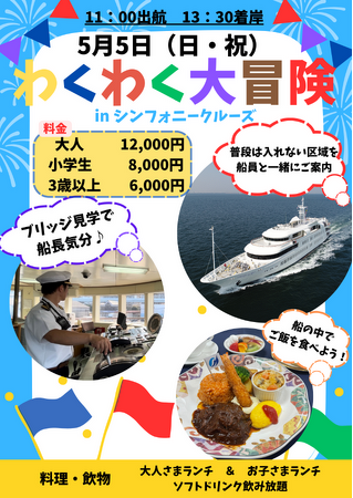 日時:2024年5月5日 9:00集合シンフォニークルーズ乗場(11:00出航・13:30着岸)