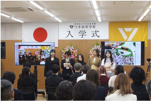 この度、開校4年目のスタートを切る、令和6年度 ワオ高校の入学式を4月12日 (金)に挙行したことをご報告します。岡山本校とバーチャルキャンパスでのハイブリッド開催で、岡山本校での司会進行を5人の在校生が務めあげました。第4期生となる新入生がリアルとオンラインで全国から参加し、ワオ高生としての第一歩を踏み出しました。
