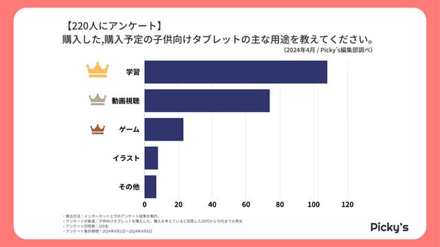 「Picky’s」は、インターネットショッピングにおいて、購入前に試せない・選ぶべきものがわからないという課題の解決を目標に、あらゆる商品のおすすめランキングや検証レビューを紹介するサイトです。このたびPicky’s(https://rentry.jp/)では、子供向けタブレットについてインターネット上でアンケート調査を行いましたので発表いたします。