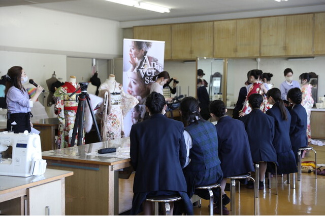 着付け体験昨年の様子昨年は山口県立熊毛北高等学校服飾デザインコース2年生にお邪魔させていただき、「18歳だからこその成人写真」と名を打ち、マスク生活で友人と過ごす日々の中、楽しい高校生活の思い出の一つとして「カタチ」に残るイベントを地元写真館として行いました。