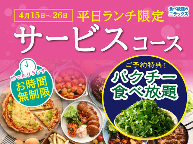バラエティー豊かな食べ放題が楽しめる『ニラックスブッフェ』22店舗で人気の平日ランチ限定の『サービスコース』。