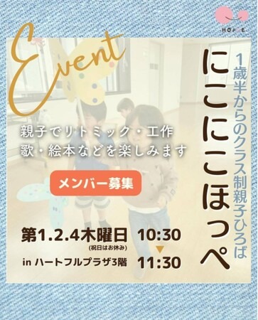また、未就園児にとって、集団生活を体験しながら工作やからだを使った遊び、リトミックなどの保育を受けられる場は貴重です。にこにこほっぺでは、様々なことを親子で楽しみながら経験することで、子どもの持つ力を伸ばし、親は子どもの成長を間近で実感したり、褒めたりすることで子どもと一緒に達成感を味わうことができます。このように、人との繋がりが生まれ、様々な経験を入園前の親子ができる場所があることは、当団体は、重要なファクターだと考え、開催を決定いたしました。ぜひこの機会に、親子で1年間を通して、子どもたちの成長を見守りながら、一緒に楽しい時間を過ごしていただければと思っております。特定非営利活動法人ほっぺ について