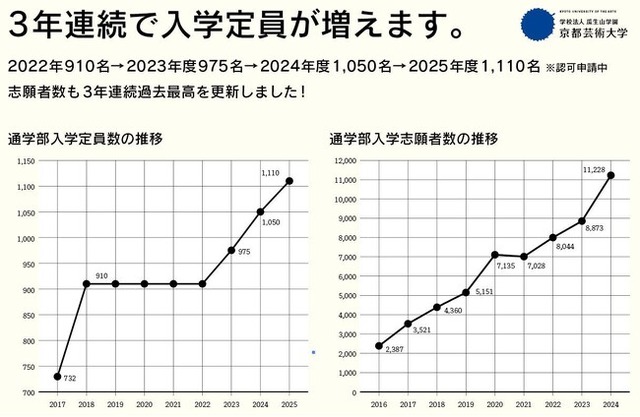 学校法人瓜生山学園 京都芸術大学(京都市左京区/学長 吉川左紀子)の、令和5年度(2023年度)入試における総志願者数が確定し、過去最高の11,228名(前年対比+2,355名 127%増)となりました。社会的ニーズが高まる情報デザイン領域の定員を2025年度入試から約1.3倍拡大(認可申請中)、新たな学びの場として2025年秋に新校舎を竣工します。