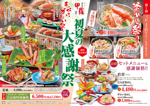 第1弾「釜めし祭り」は蟹の旨味が凝縮した甲羅本店名物のかに釜めしをはじめ季節の釜めしが最大5割引きとなるゴールデンウイーク中の特別企画です。こどもの日のお祝いにあわせて、お子様に人気のかに釜めしをお得に楽しめるまたとない機会なのでお見逃しなく!