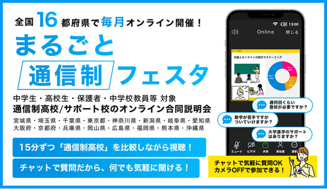 このような背景で学びの多様化が広がる中、「自分に合った通信制高校を見つけたいと思ったとき、いつでも開催されている通信制高校の合同説明会」をコンセプトとして、リクメディアは全国16都府県で『まるごと通信制フェスタ2024』を2024年5月から2025年4月までの12ヶ月間、毎月オンライン開催する。