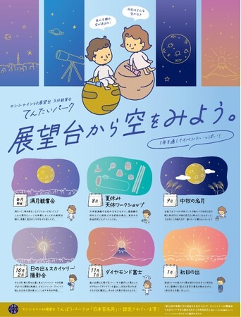 「空の公園」をコンセプトとする「サンシャイン60展望台 てんぼうパーク」(東京・池袋)では、「てんたいパーク」と題し、年間を通して様々な天体観賞会を実施しています。2024年度は、毎月満月の日に満月観賞会を実施するほか、9月には「中秋の名月」、11月と1月に「ダイヤモンド富士」、元旦には「初日の出」などの観賞会を予定しております。