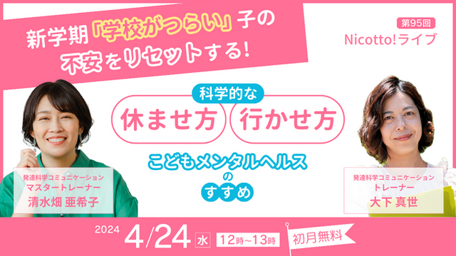 そこで、学校が苦手な子どもが元気に登校できるための学校の休ませ方の新常識をお伝えすべく、2024年4月24日にNicotto!塾で「新学期「学校がつらい」子の不安をリセットする!科学的な 休ませ方・行かせ方~こどもメンタルヘルスのすすめ~」をテーマでオンラインライブを開催します。