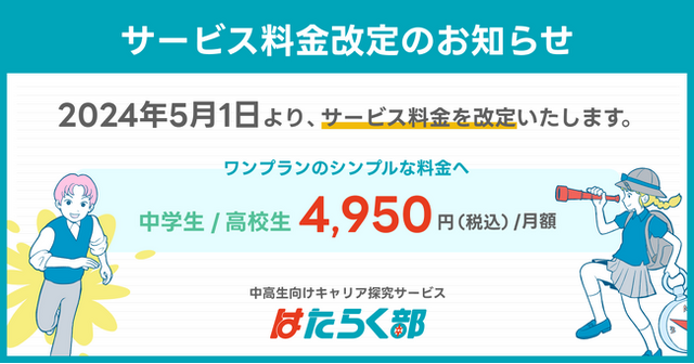 株式会社RePlayceが運営する中高生向けキャリア探究サービス「はたらく部」は、2024年5月1日より中学生コース・高校生コースの料金プランを改定し、4,950円(税込み)に統一することをお知らせいたします。