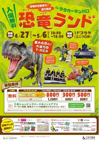 期間中、家族みんなで楽しめる大人気の『恐竜ランド』の他、『最大5%戻ってくるPayPayクーポン』、人気ゲーム機やララガーデン共通お買物・お食事券などが当たる『GW大抽選会』やユニクロ、GU、ニトリ デコホーム、アカチャンホンポ限定の『ポイントアップデー』などで地域のみなさまへ大還元!