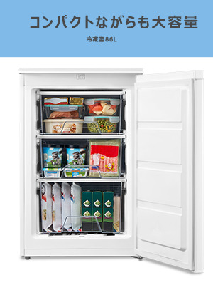 *【大容量冷凍ストック】86Lの庫内サイズで、サイズの異なるケースに、様々な食品を収納できって、たっぷりきれいに収納できる。