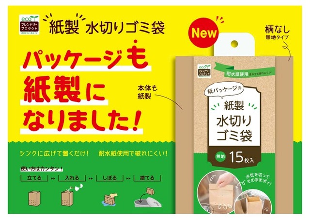 同カテゴリの製品はプラスチック素材を使用しているものが多い中、この「紙製水切りごみ袋」は脱プラスチックを推進するアイテムとなります。