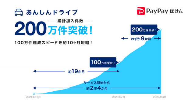 LINEヤフー株式会社(以下、LINEヤフー)のグループ会社である、PayPay保険サービス株式会社(以下、PayPay保険サービス)、Zフィナンシャル株式会社とPayPay株式会社(以下、PayPay)は、キャッシュレス決済サービス「PayPay」内のミニアプリ(※1)「PayPayほけん」で提供している、借りた車での運転中の事故を補償する保険商品「あんしんドライブ(1日自動車保険)」(以下、本保険)の累計加入件数が、2021年12月の提供開始から約2年4カ月で200万件を突破しました。なお、提供開始後100万件突破までに約1年7ヶ月(約19ヶ月)でしたが、100万件から200万件までは2倍以上のスピードで加入が増加し約9ヶ月で達成しています(※2)。特に帰省が多い年末年始は1日に1万件を超える加入件数を記録しました。